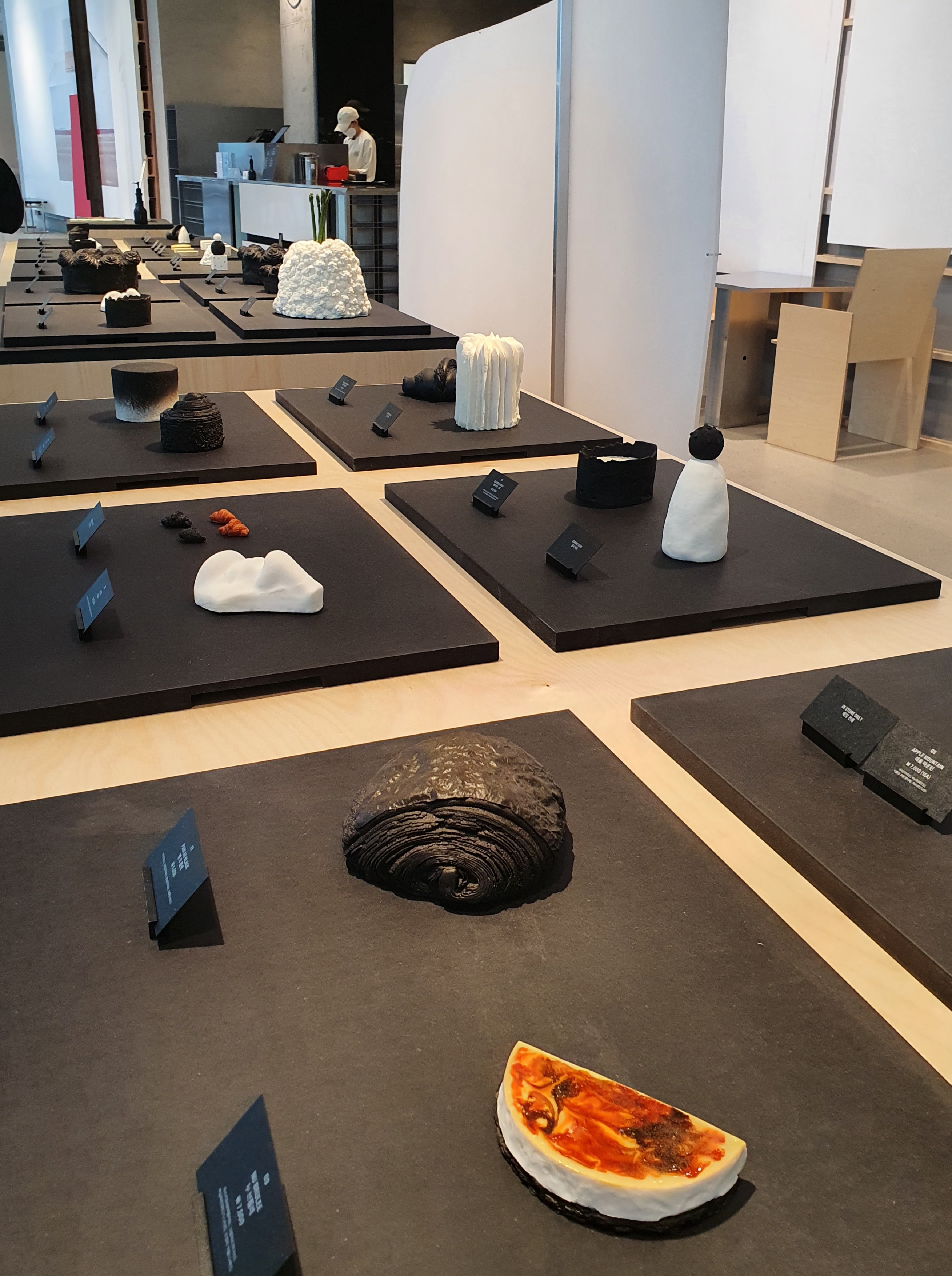 제일 유명한 피크 케이크는 겉은 먹물 패스트리이고 중앙엔 말차 크림이 가득 들어있다.