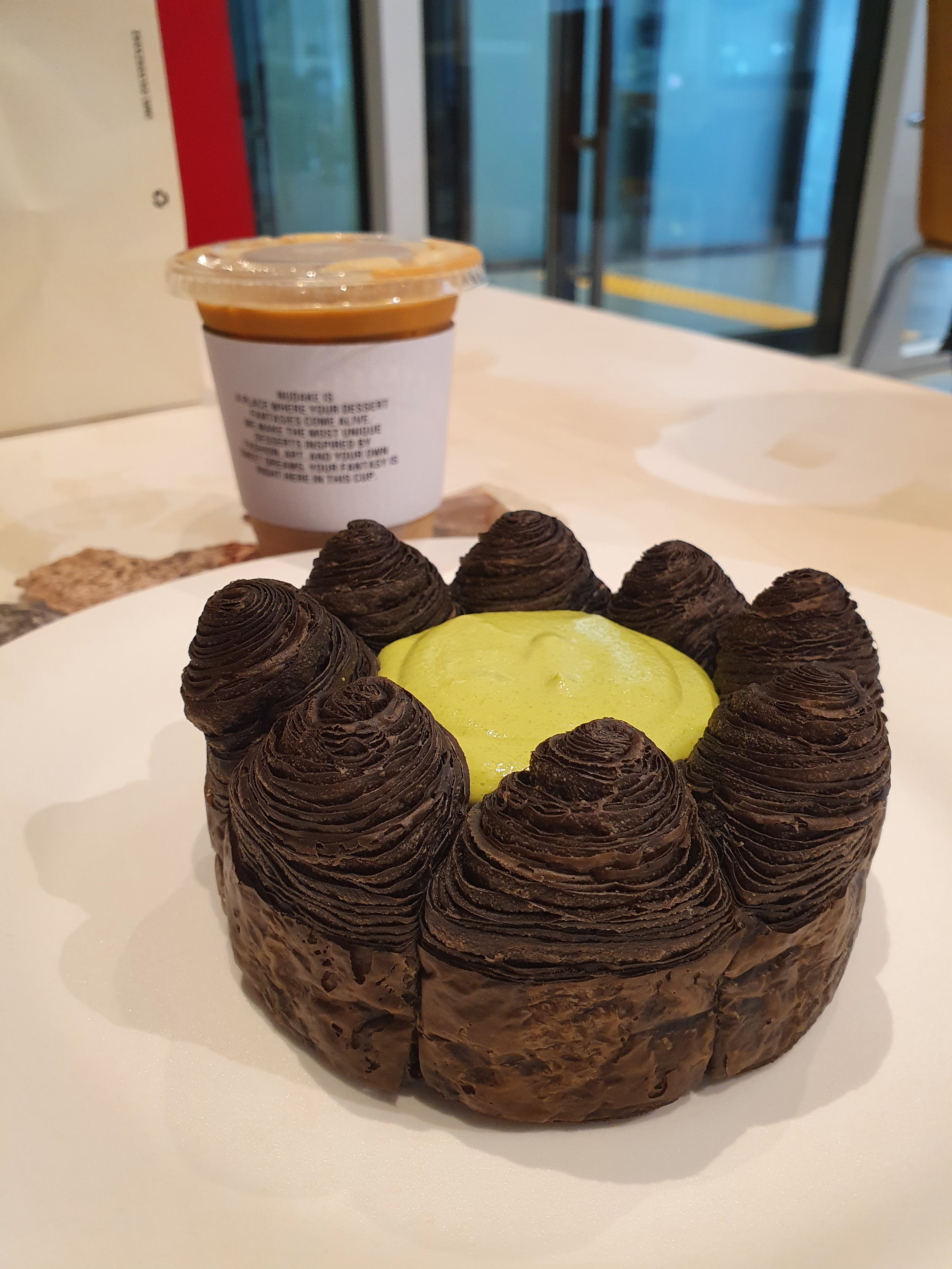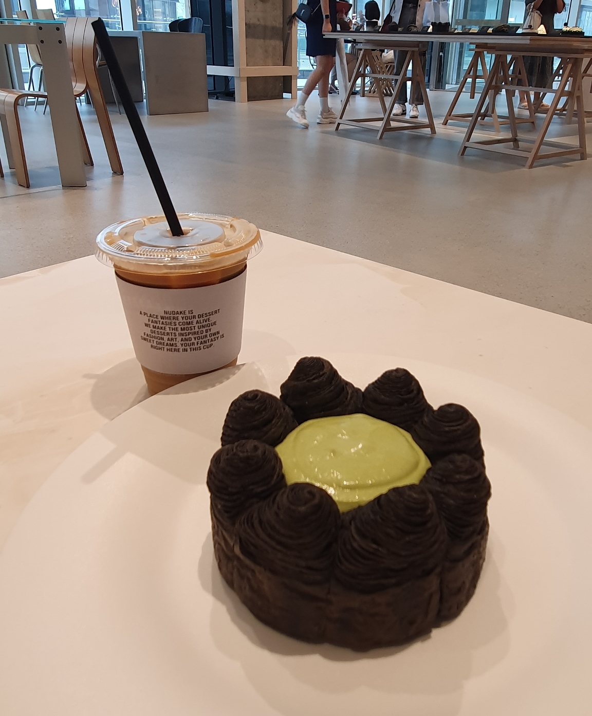 여느 케이크처럼 촉촉하거나 폭신한 느낌이 아닌, 바스락 부서지는 페스트리를 말차 크림에 찍어먹는 형태의 케이크였다.